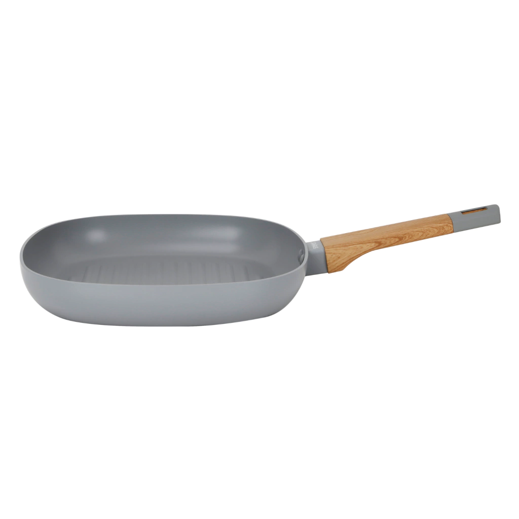 Este grill de 28 cm está fabricado en aluminio de 3 mm de espesor, lo que garantiza una distribución uniforme del calor y una excelente durabilidad. Su diseño en color grey con mangos y asas simil madera aporta un toque moderno y elegante a cualquier ambiente culinario.
